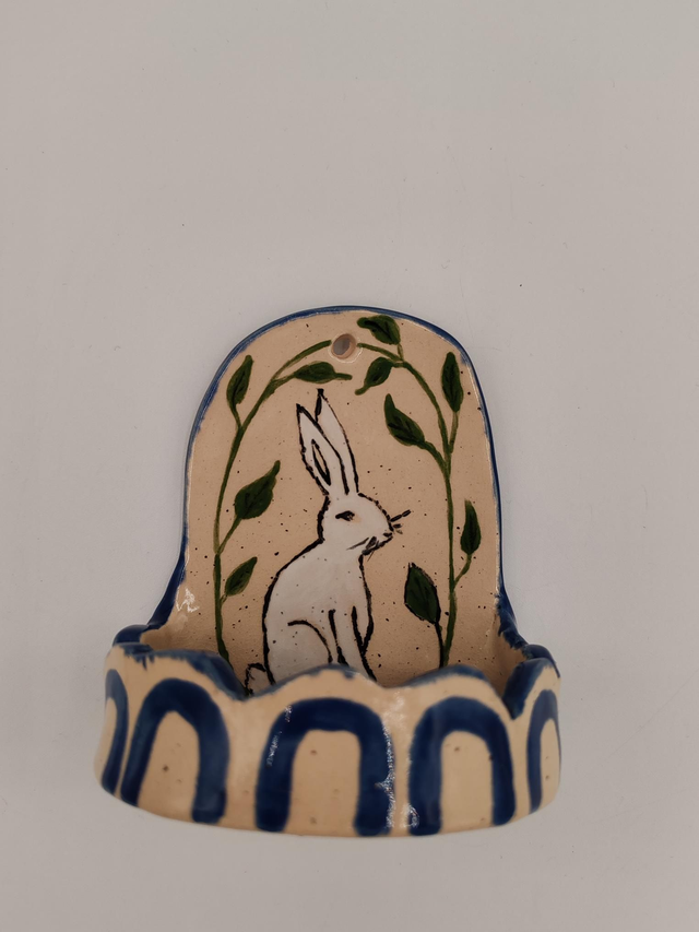 Ce porte-bougie mural en céramique entièrement fait main apportera une touche poétique et naturelle à votre intérieur. Son délicat motif de lapin entouré de feuillage évoque la sérénité et la douceur d’une balade en forêt. Idéal pour créer une lumière tamisée et chaleureuse, il peut être suspendu au mur ou simplement posé sur une étagère.