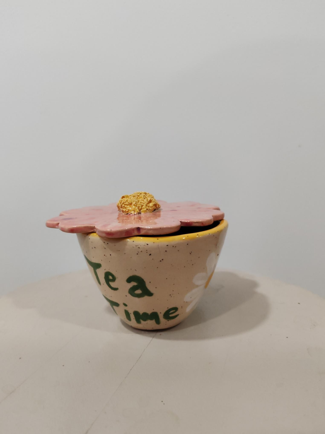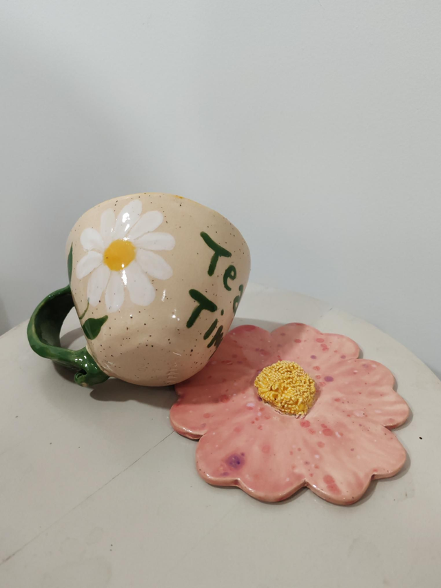 - Motif : Marguerite peinte à la main + texte "Tea Time".